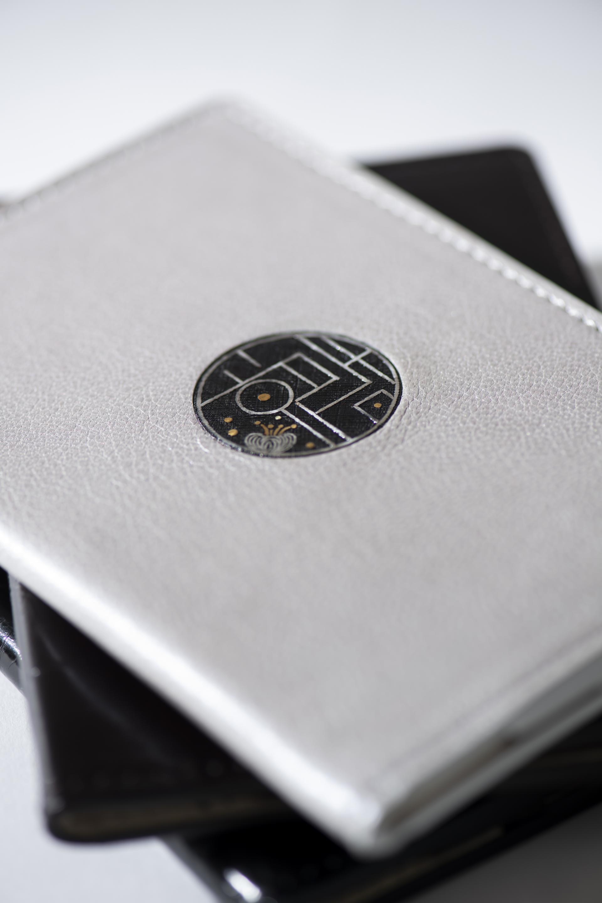 This is a silver inlay circular decorative passport case featuring the Gongyeedam logo with traditional Korean lattice patterns and an added touch of magnolia flowers for an accent.