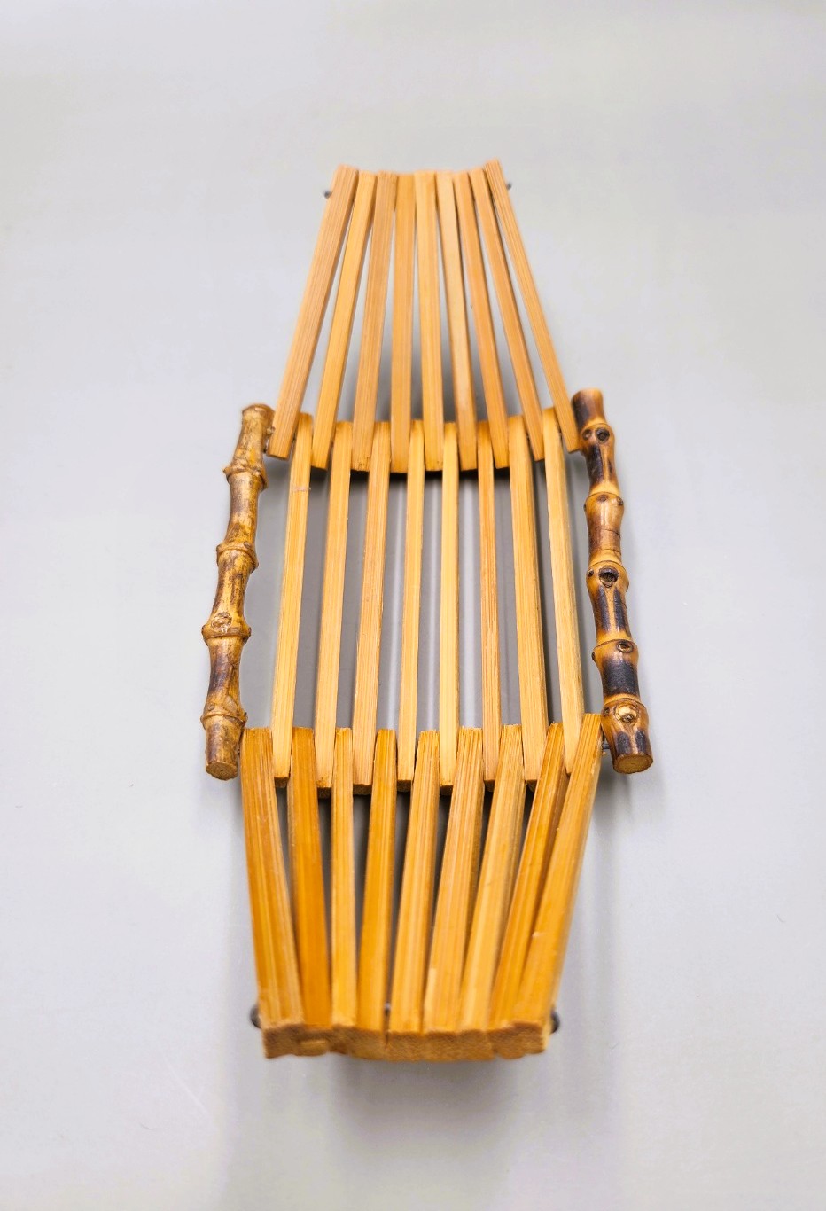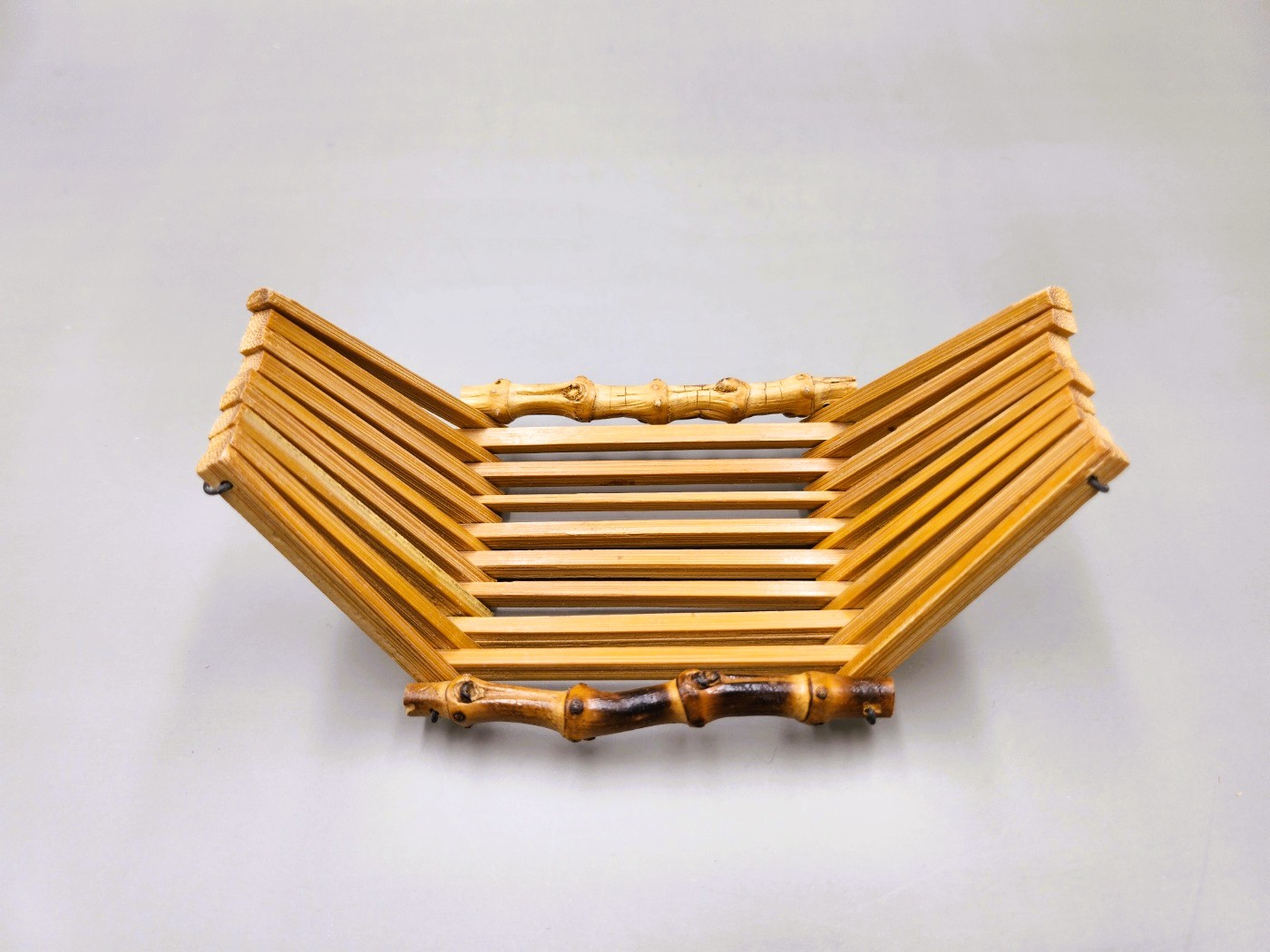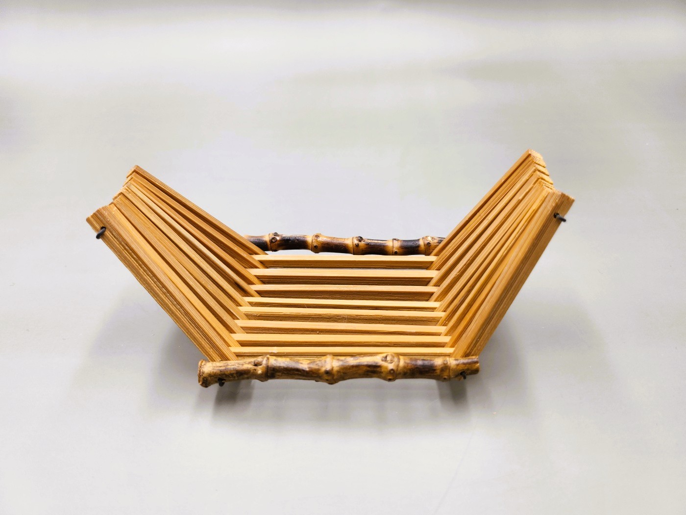 This is a vintage Japanese bamboo tray, gently curved like a small boat.
