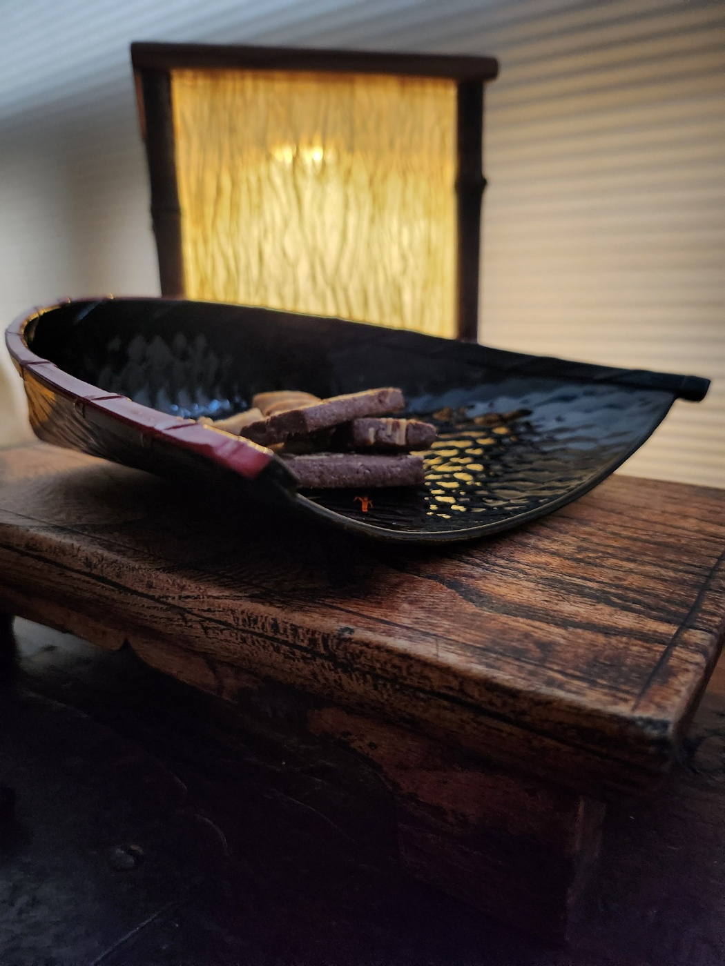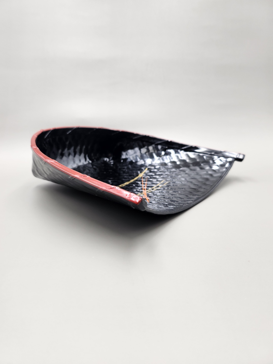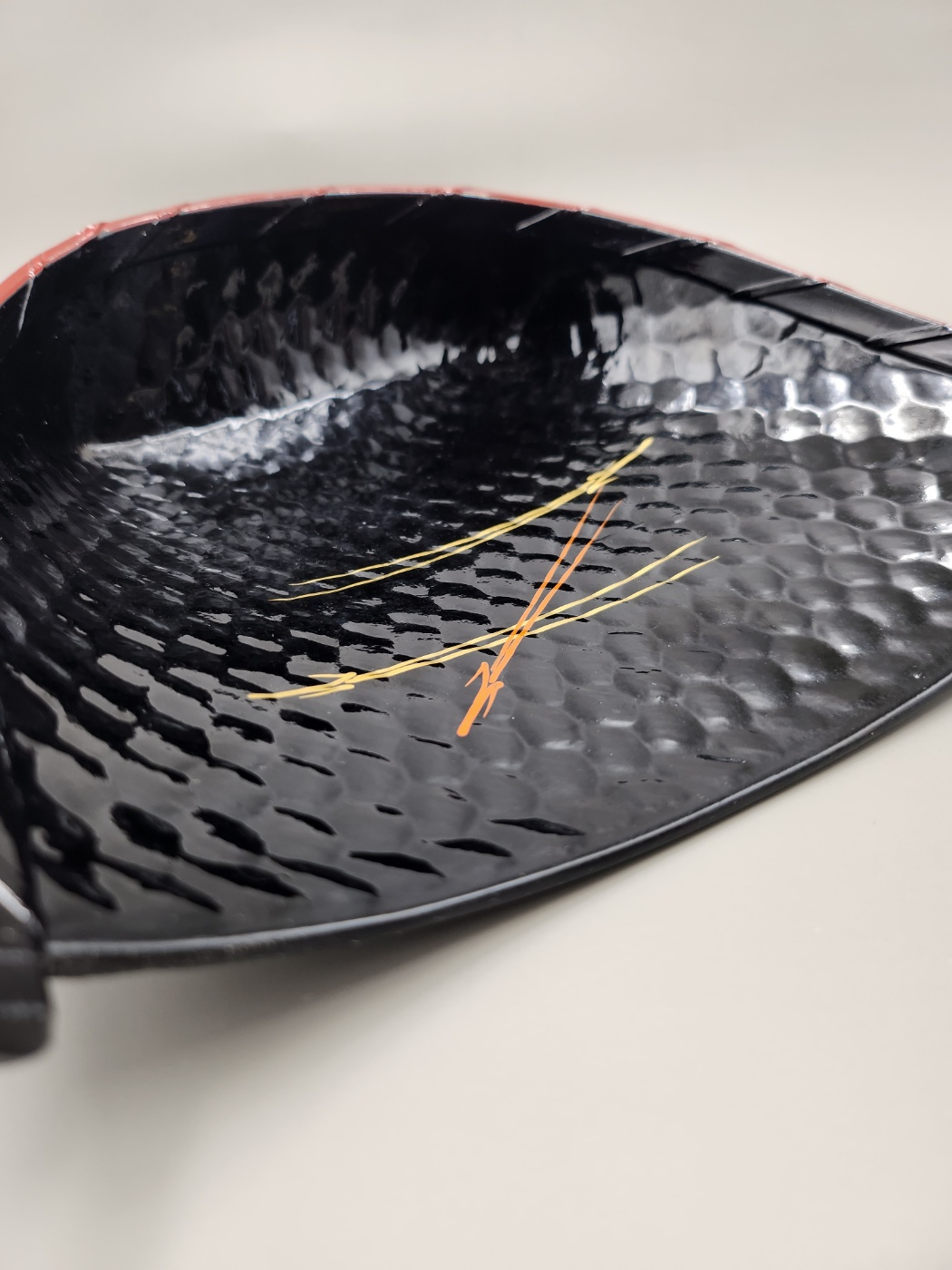Japanese vintage lacquered dessert dish inspired by the shape of a traditional winnowing tray (ki, 箕). Set against deep black lacquer, the delicate pine needle motif adds a quiet elegance, making it ideal for serving Korean dasik or Japanese wagashi.