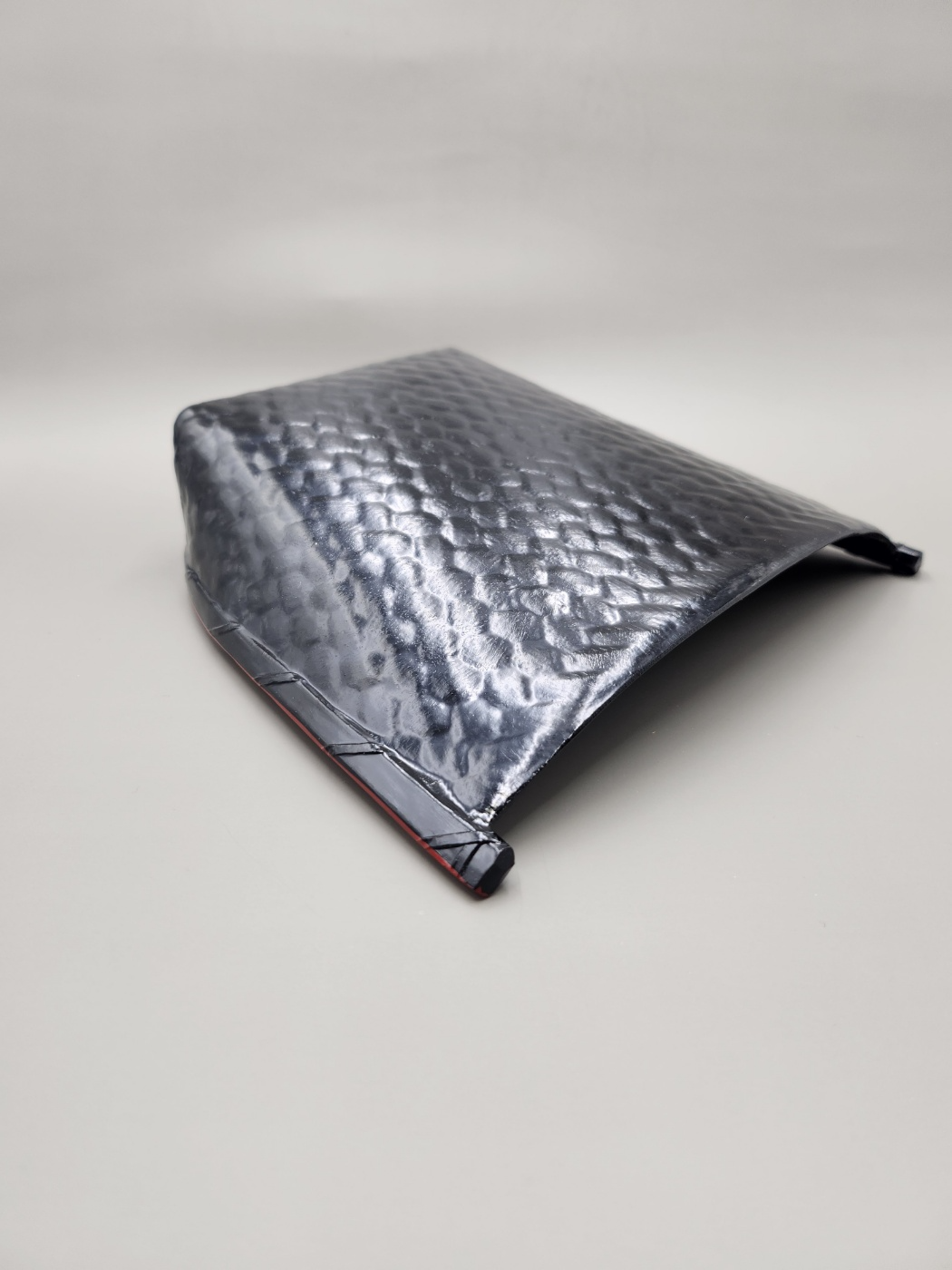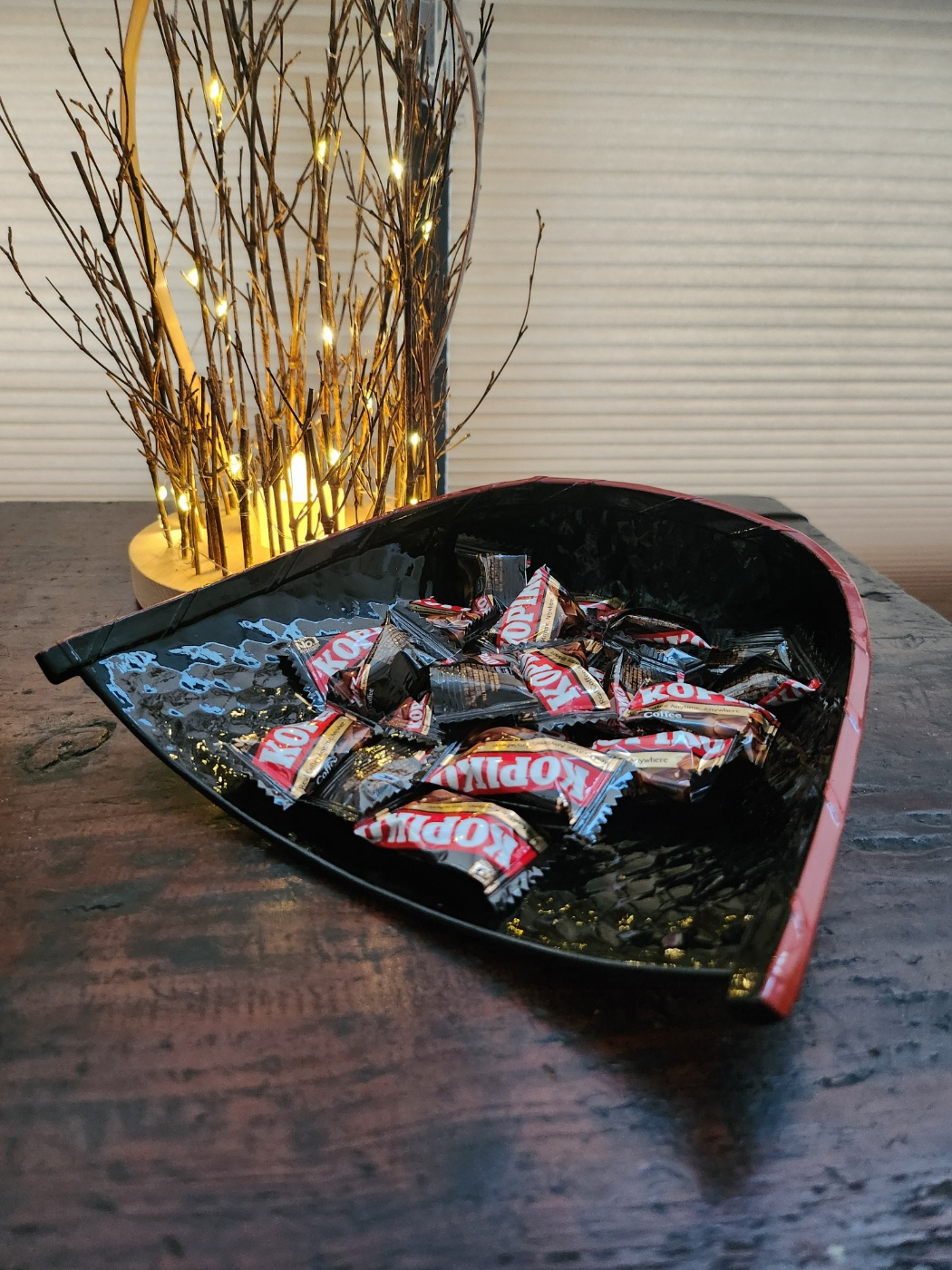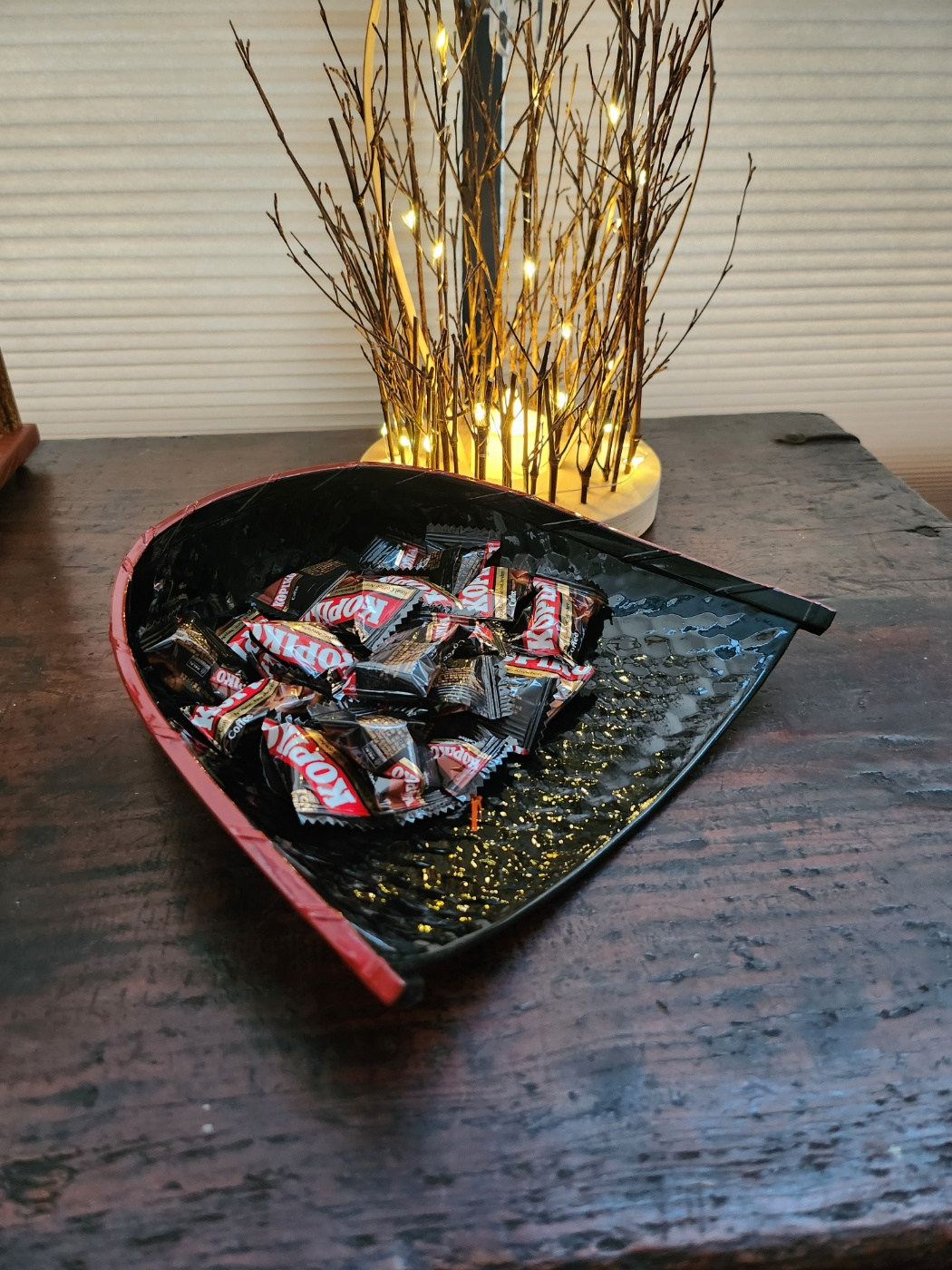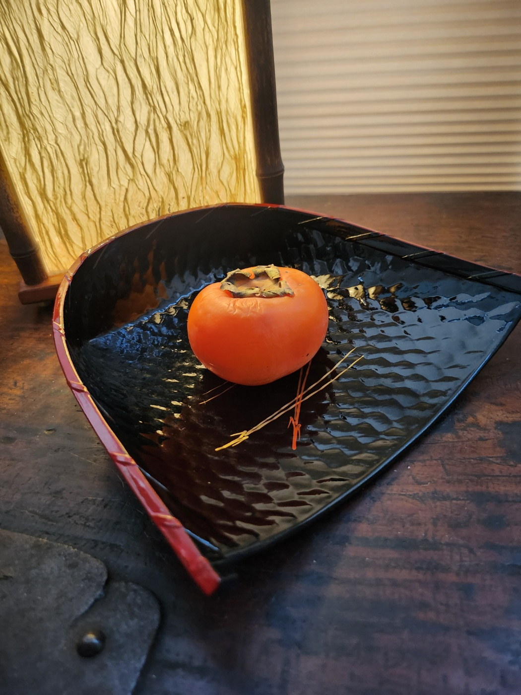 Japanese vintage lacquered dessert dish inspired by the shape of a traditional winnowing tray (ki, 箕). Set against deep black lacquer, the delicate pine needle motif adds a quiet elegance, making it ideal for serving Korean dasik or Japanese wagashi.