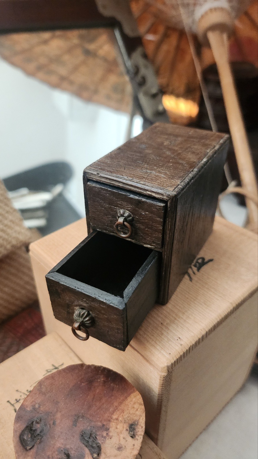 Made in Japan around the 1930s, it was likely used to store medicine, seals, or small personal items. The interior is finished in black lacquer, while the patina and texture shaped by time remain intact. A one-of-a-kind vintage piece.